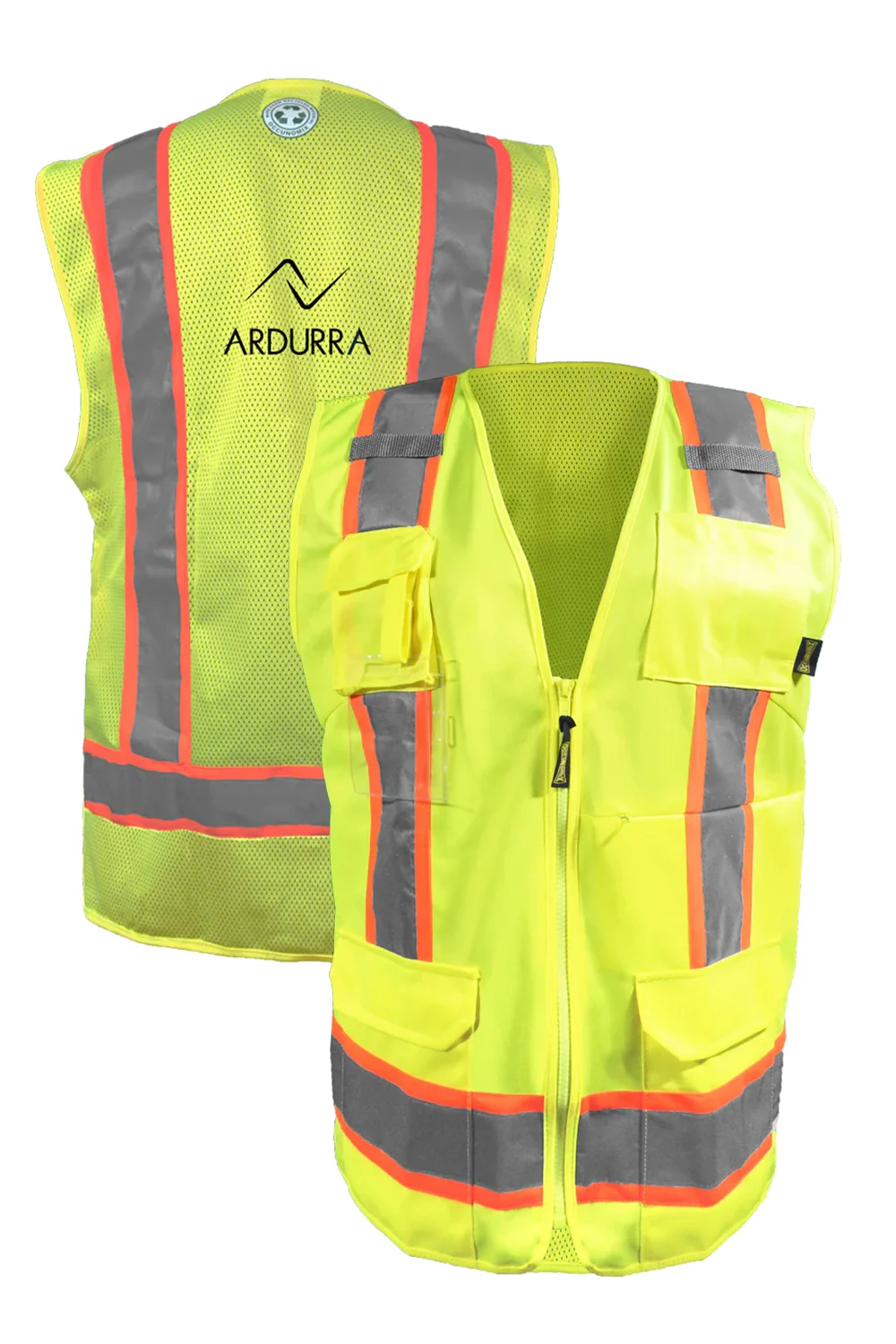 The Women’s Sustainable Two-Tone Vest is built for visibility, function, and a tailored fit. Crafted from 100% post-consumer recycled polyester with a tricot front and breathable mesh back, it meets ANSI/ISEA 107 Type R Class 2 standards. The design includes smaller armholes, bust darts, slimmer shoulders, and contoured side seams for comfort and mobility, along with a drop-tail hem and side slits for added coverage and ease of movement. Featuring 2″ reflective tape with contrasting trim and nine pockets—including specialized compartments for tools, ID, phone, and flashlight—this vest blends safety, sustainability, and practicality in one.